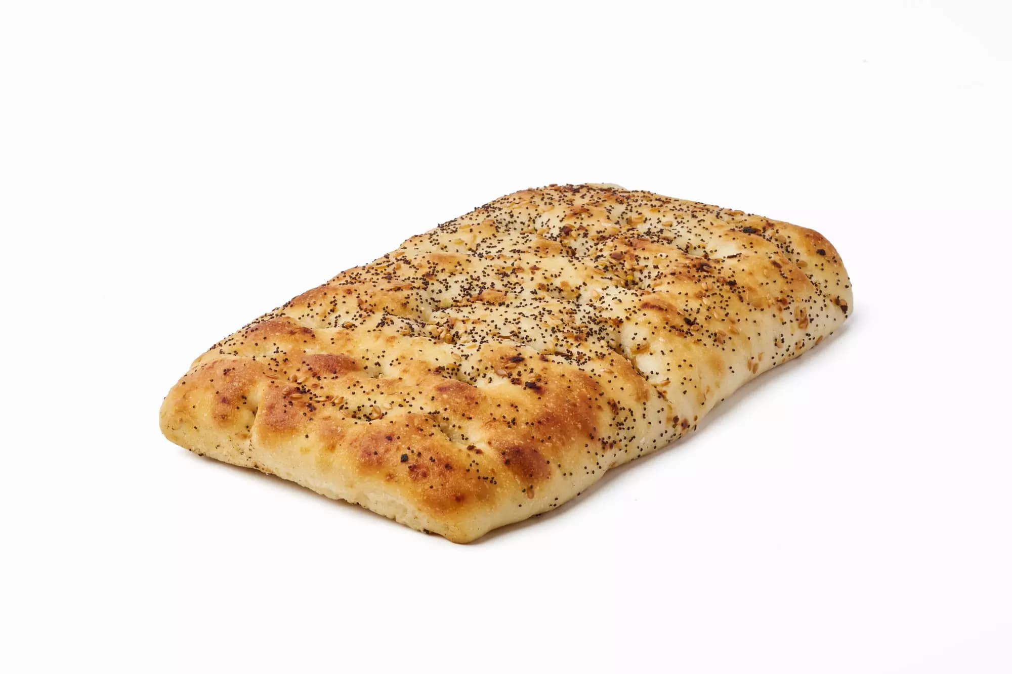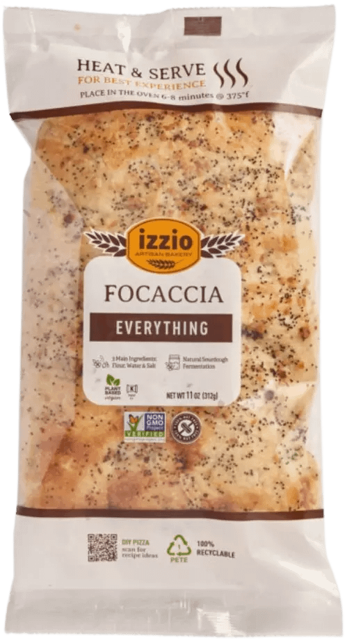 Our Everything focaccia is leavened with natural sourdough starter and baked in the traditional Italian style, indented with small pockets of olive oil goodness. Packed with the savory flavors of everything seed mix, this loaf is loaded inside and out with toasted flax and poppy seeds, onion, and garlic.