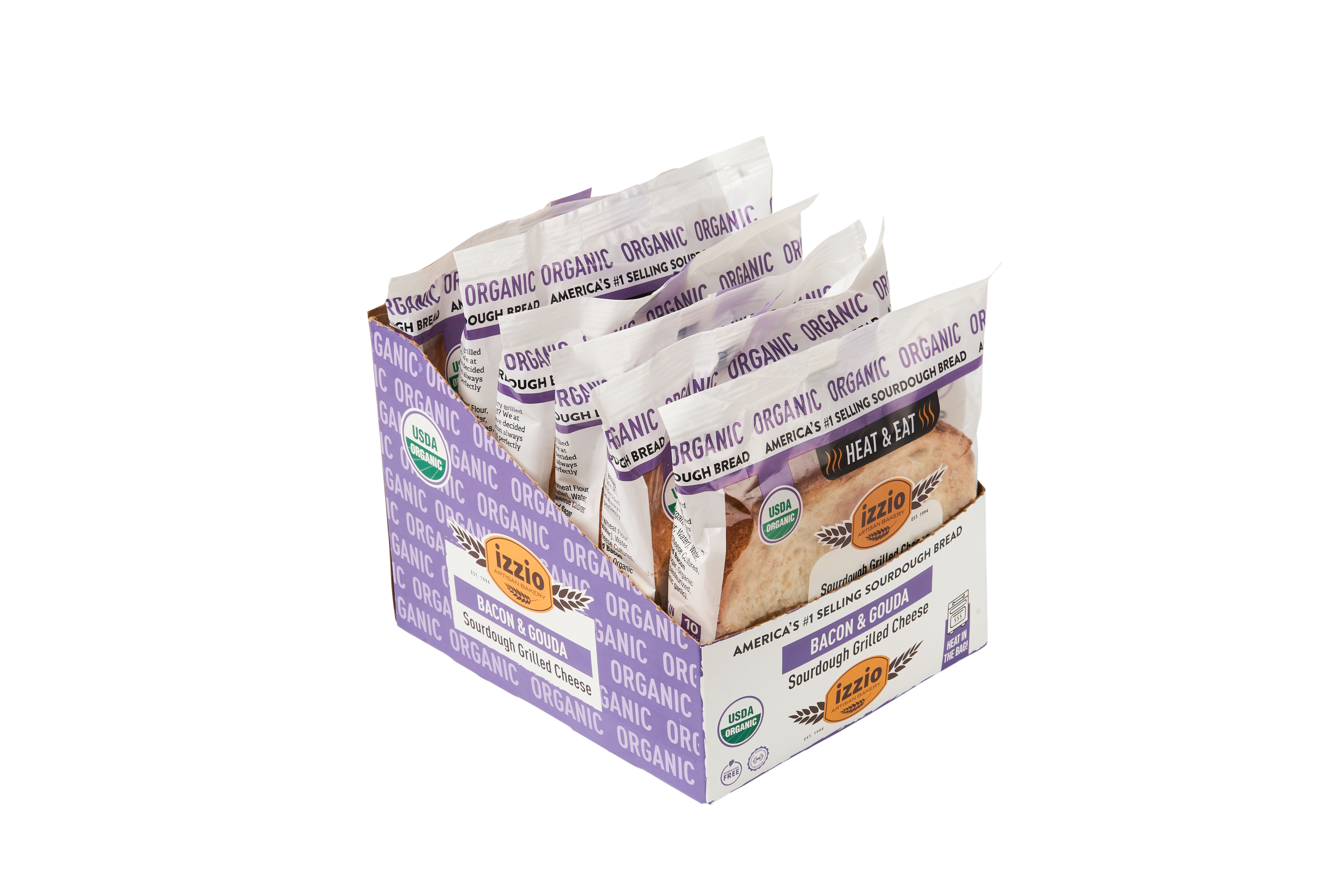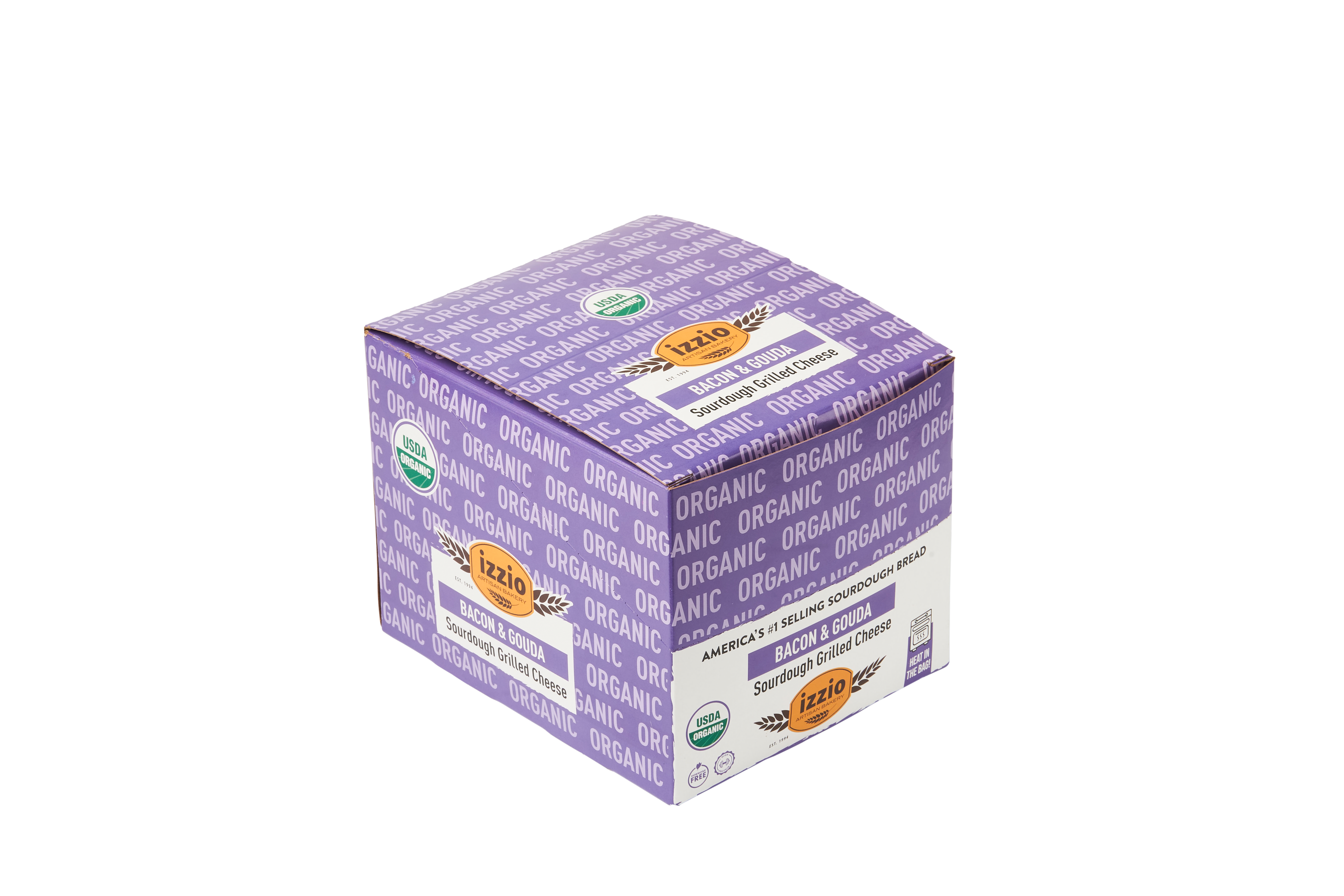 izzio Organic Sourdough (Organic Wheat Flour, Organic Sourdough Culture [Organic Wheat Flour, Water], Water, Salt), Organic Gouda (Pasteurized Organic Milk, Cheese Cultures, Sea Salt and Vegetable Enzymes), Organic Applewood Smoked Uncured Bacon (Organic Pork, Water, Sea Salt, Organic Cultured Celery Powder (Organic Cultured Celery Powder, Sea Salt), Organic Cultured Butter (Organic Pasteurized, Cultured Cream, Salt), Organic Garlic Powder (Organic Garlic).